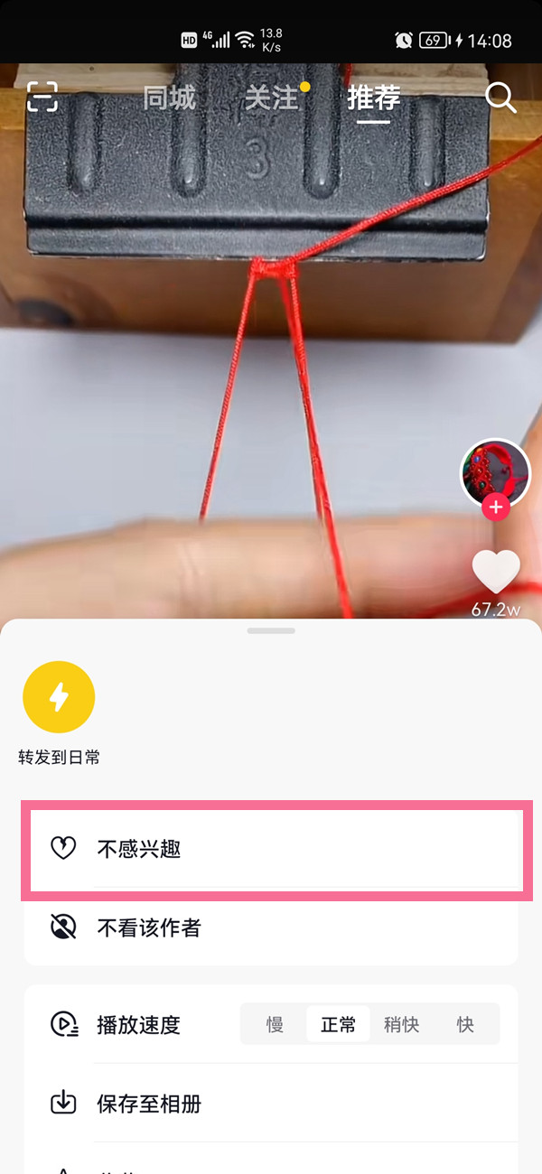 2、点击【不感兴趣】,系统将减少该类视频推荐。