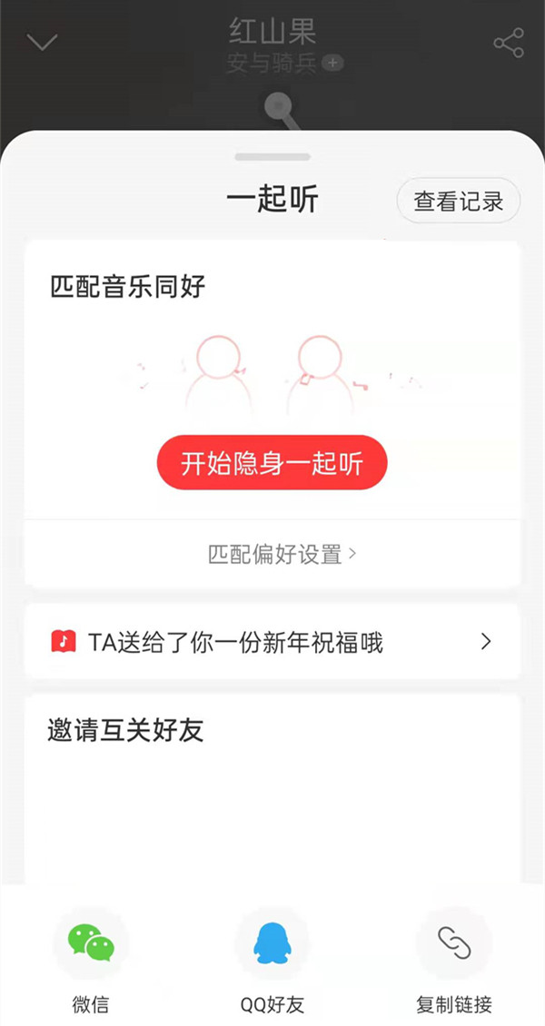 3、可系统匹配陌生人一起听,也可以邀请互关好友或者微信、QQ等好友一起听。
