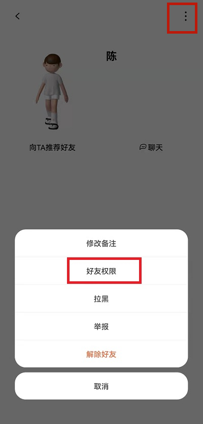 1、打开啫喱ap,进入好友主页,点击右上角三个点,再点击好友权限。