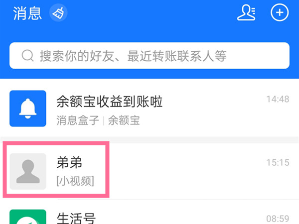1、打开支付宝app,点击消息,点击需要退回红包的联系人。
