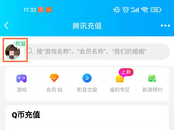 2、点击充Q币,在腾讯充值界面点击左上角头像进入个人中心界面。