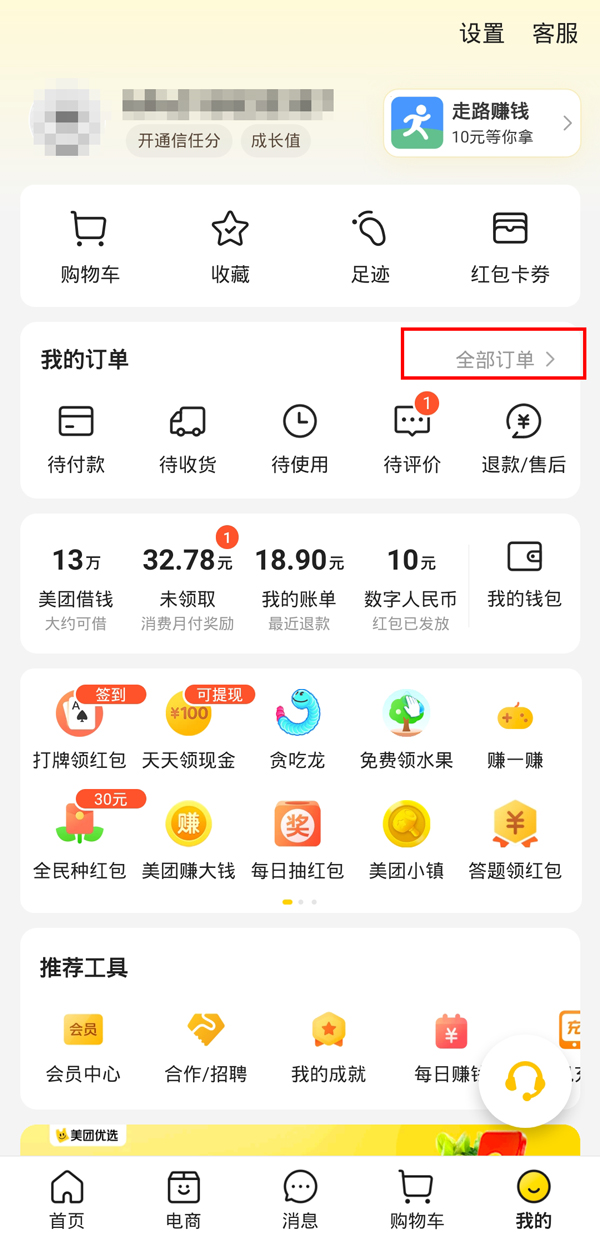 1、打开美团app,点击【我的】,点击【全部订单】。