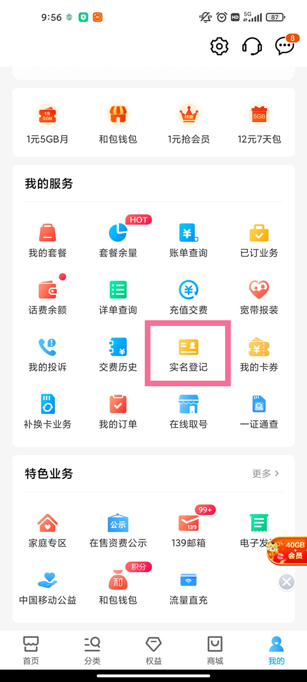 1、打开中国移动APP,在“我的”页面点击【实名登记】。