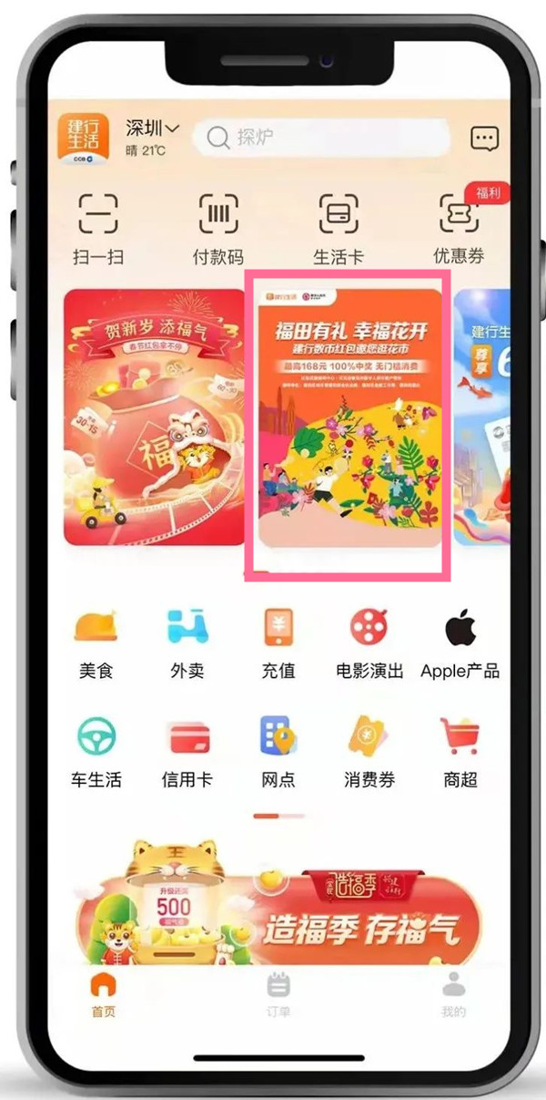 1、打开建行生活APP首页,点击数字人民币活动海报。