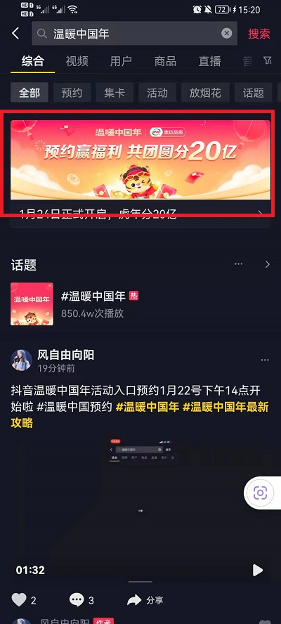 1、打开抖音app,在搜索框中输入【温暖中过年】点击搜索。