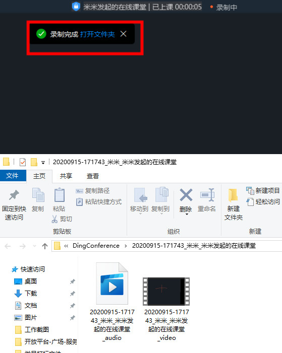 3)、通过在线课堂录制功能录制的视频。老师录制完成后,点击【取消录制】,界面会提示:录制完成,打开文件夹。点击【打开文件夹】可以在电脑本地查看录制的视频和保存地址。
