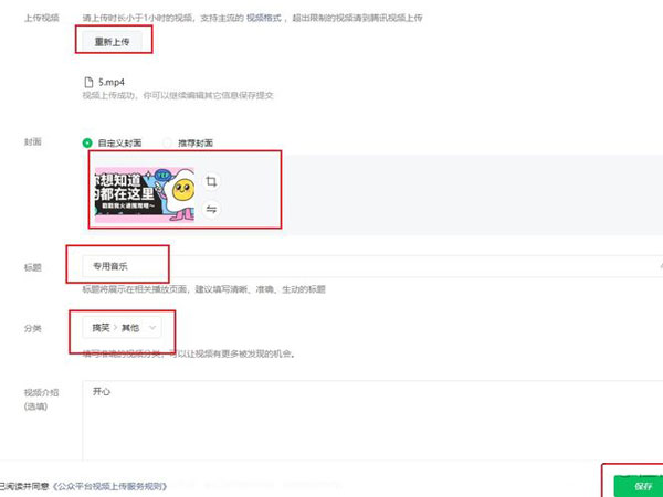 3、按提示上传视频与填写相关信息,点击【保存】,审核通过即可发视频。