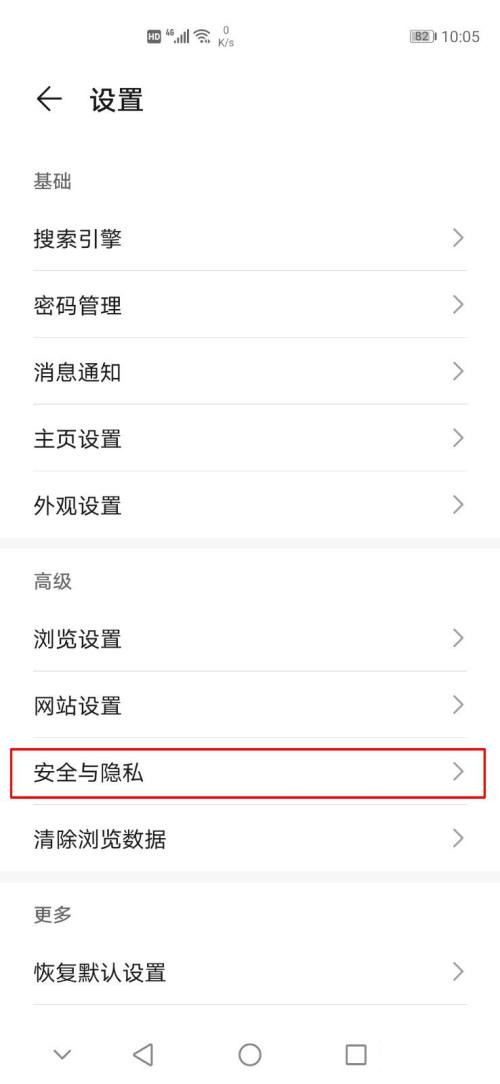2、点击安全与隐私,将【安全浏览】右侧的开关关闭即可解除网站访问限制。
