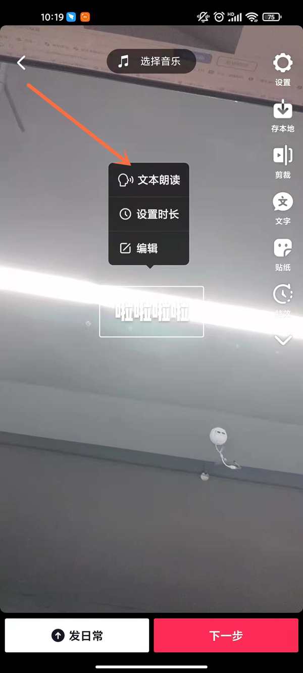 1、打开抖音app,在发视频界面点击输入的文字,再点击文本朗读。