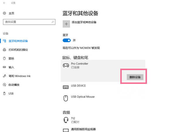 2、进入蓝牙设置,点击连接的手柄名称,选择【删除设备】即可。