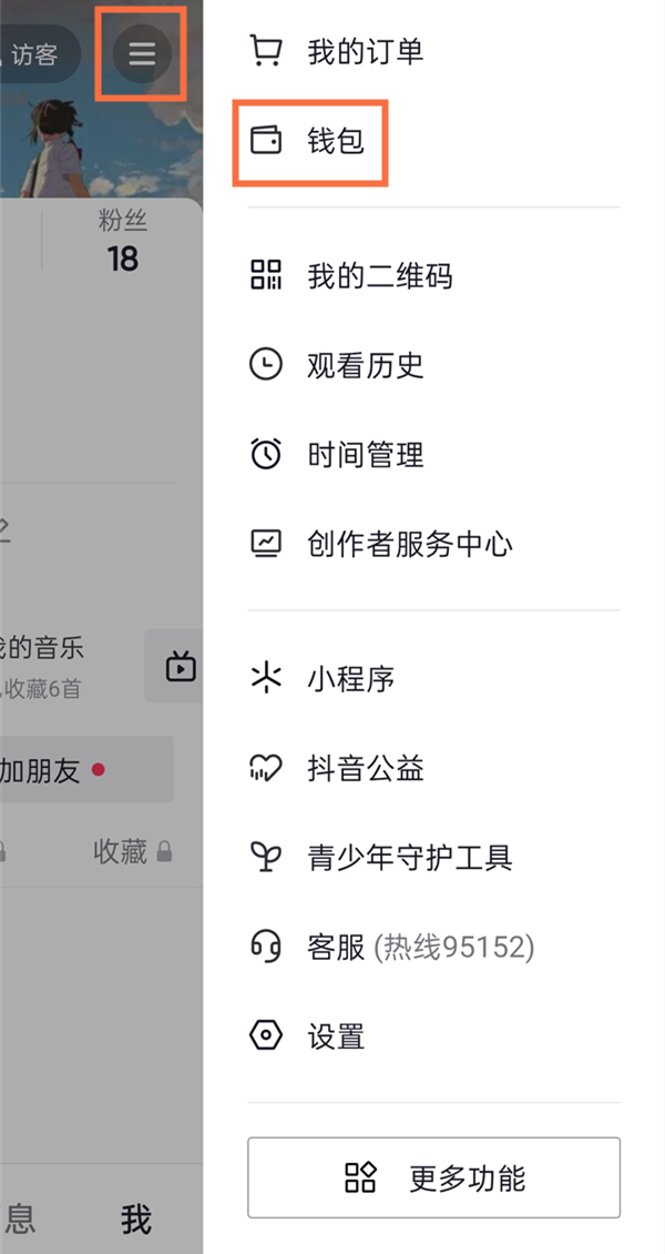 1、点击三横图标,点击钱包。