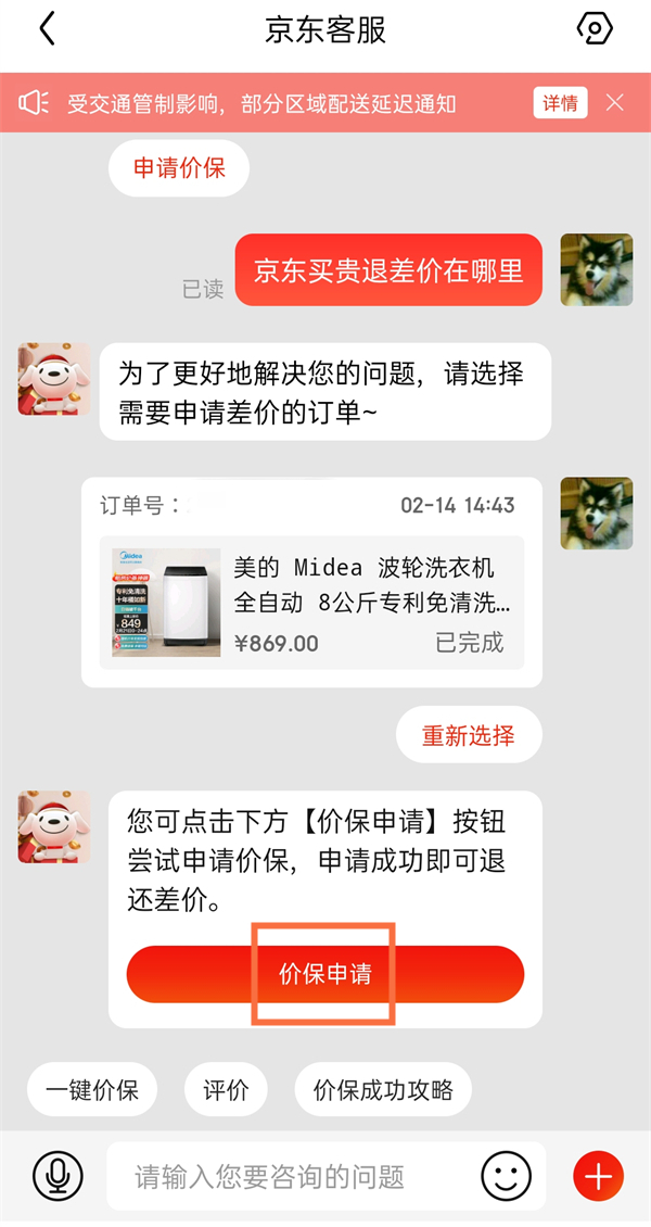 3、在京东客服聊天页面咨询相关问题,选择订单后申请保价即可。