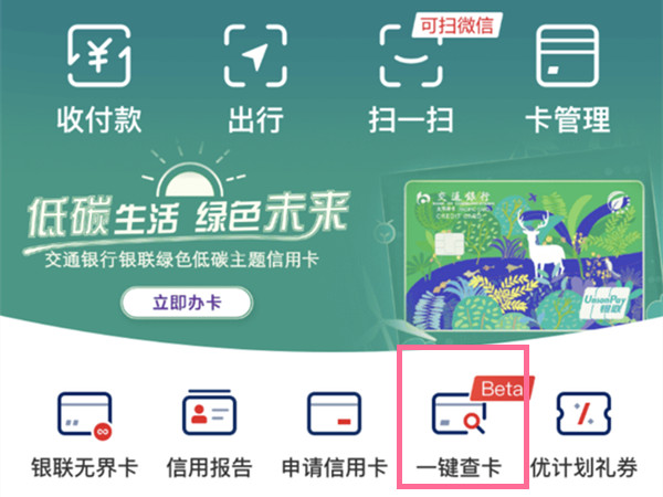 1、打开云闪付app,在首页点击【一键查卡】。
