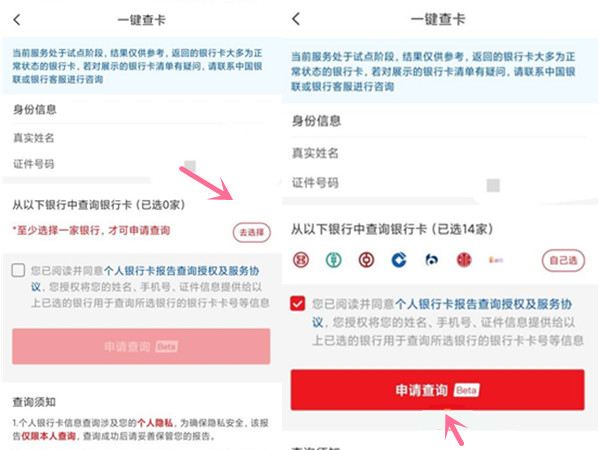 2、在页面中确认身份信息,点击【去选择】,选择银行后,点击【申请查询】即可。