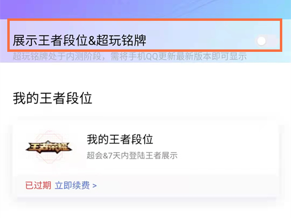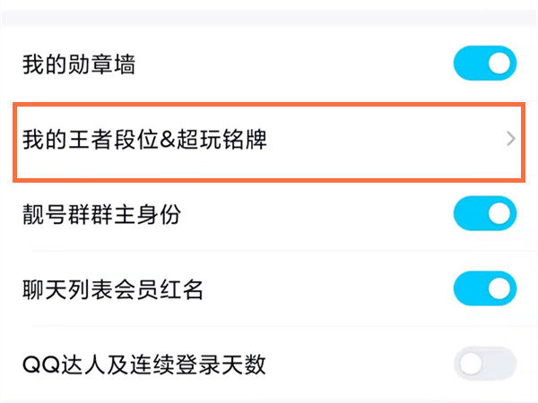 3、点击我的王者段位&超玩铭牌,将展示我的王者段位&超玩铭牌的开关关闭即可。