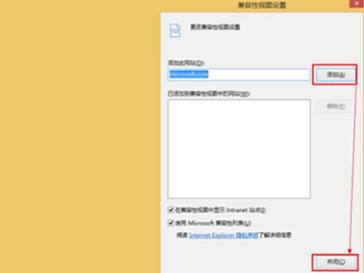 2、点击添加按钮来添加要使用兼容模式的网站,并点击关闭。