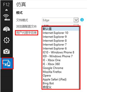 3、在桌面IE模式中,按键盘F12按钮调出左侧,点击防真图标,选择浏览器配置文件即可。
