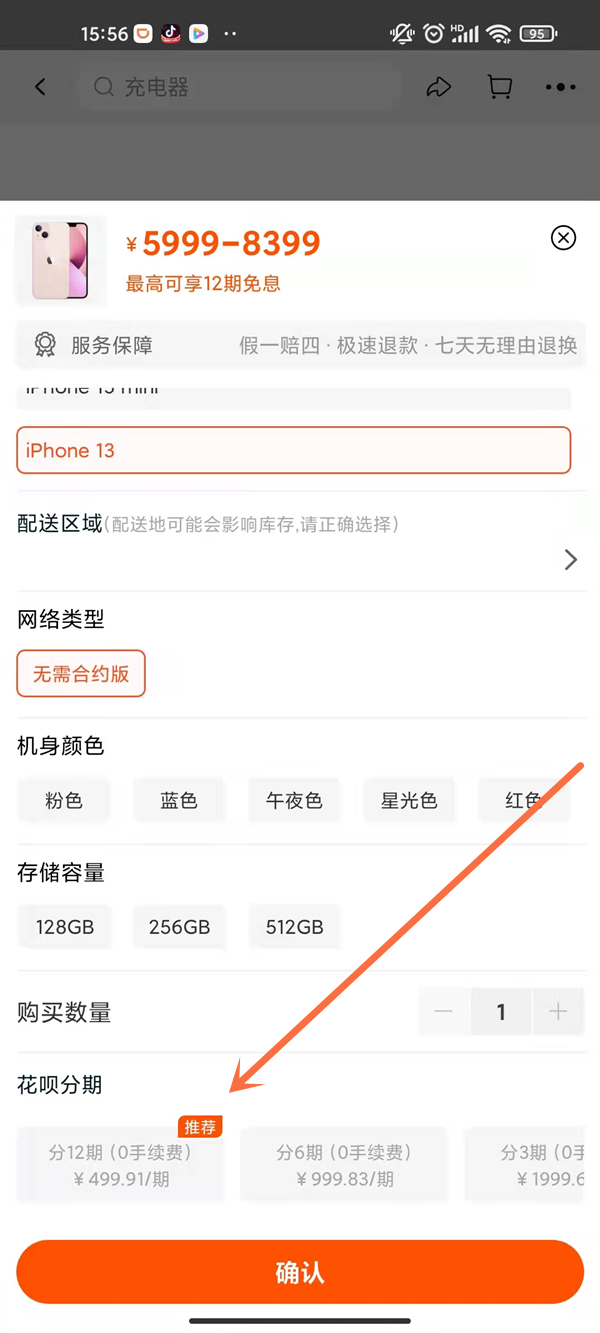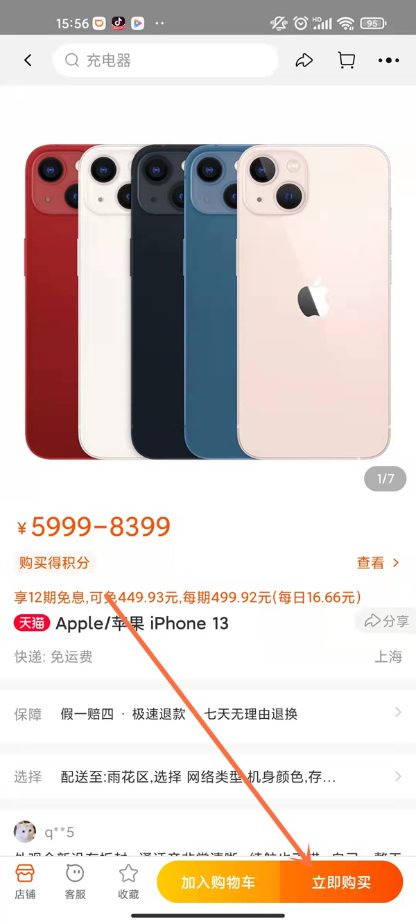 2、点击立即购买,选择内存和颜色,再选择分期即可。