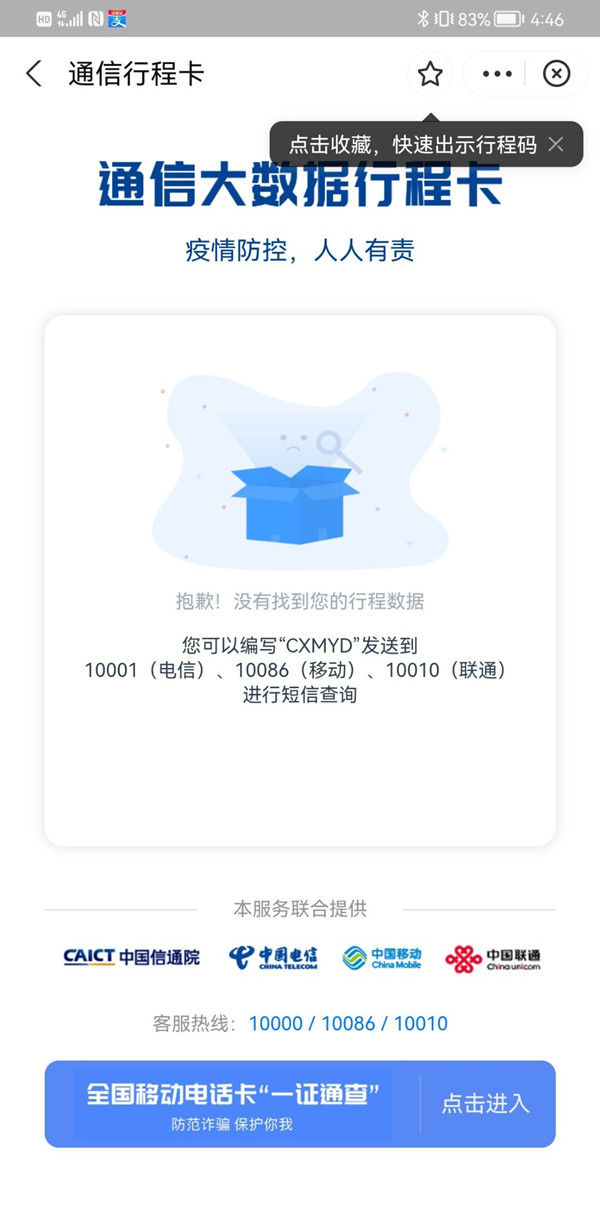 通信行程大数据卡(行程码)是由工信部指导,中国信通院、中国移动、中国电信、中国联通共同推出的公益性的形成查询服务。它可以免费为用户提供本人过往14天内到访过的国家和地区停留满4小时的国内城市证明。