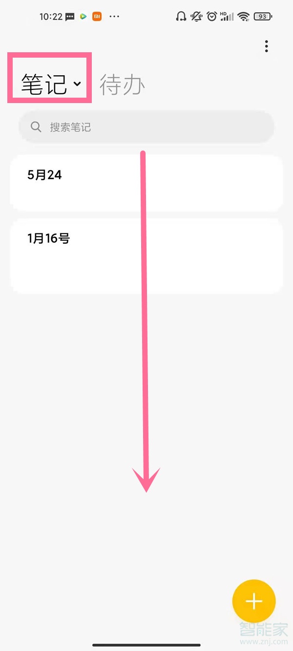 1、打开手机桌面上的【笔记】app,在笔记页面下拉。