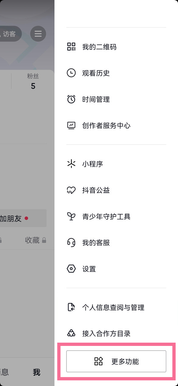 1、打开抖音,在“我”界面点击三横图标,选择【更多功能】。