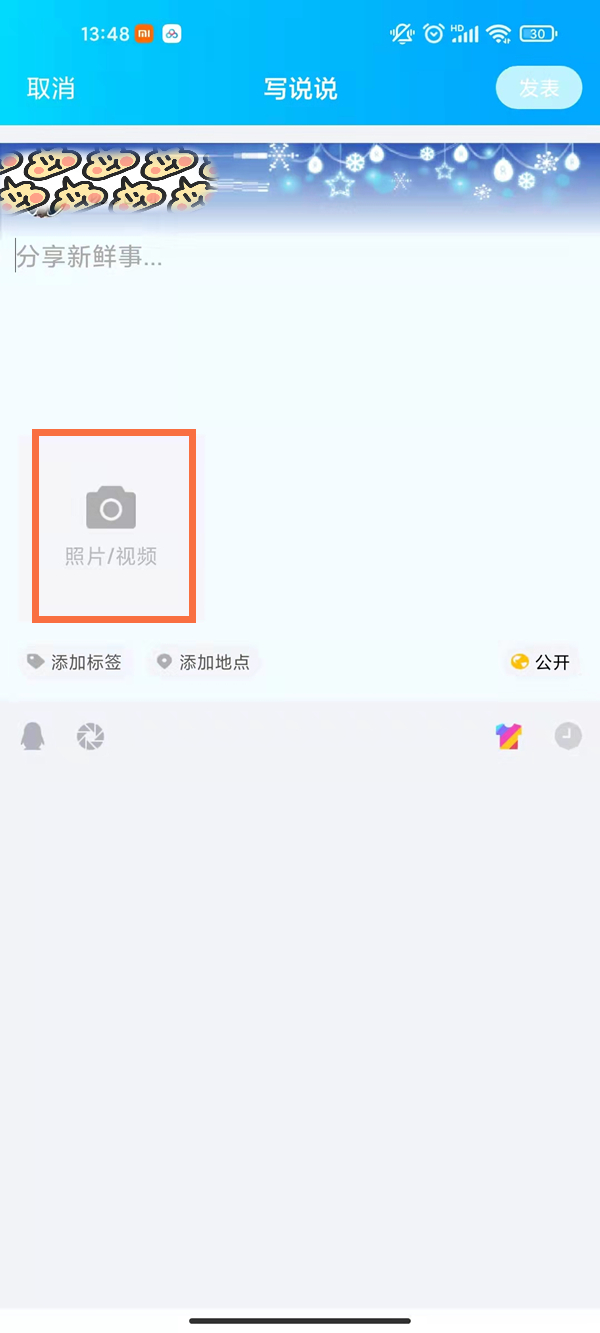 1、打开手机QQ,在写说说界面点击照片/视频。