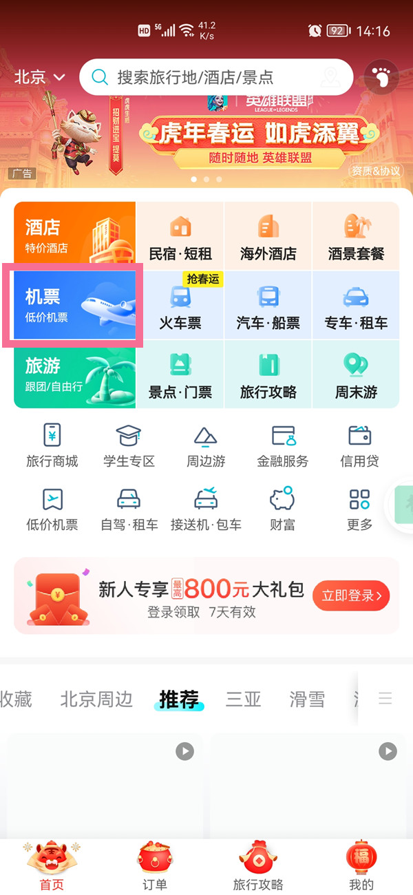 1、打开去哪儿旅行APP,在首页点击【机票】。