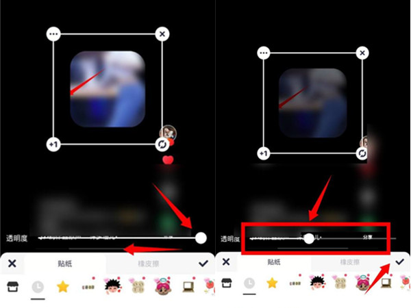 5、点击勾,向左滑动透明工具条,将透明度调整为50%时,两张图片会透明叠加。