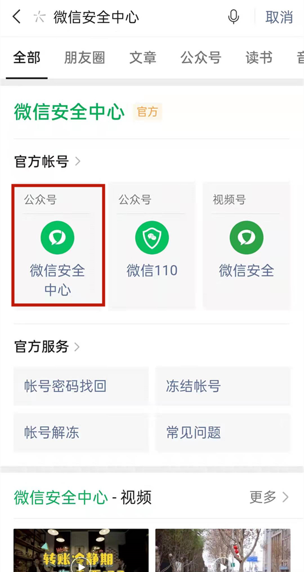 1、搜索并进入微信安全中心公众号。