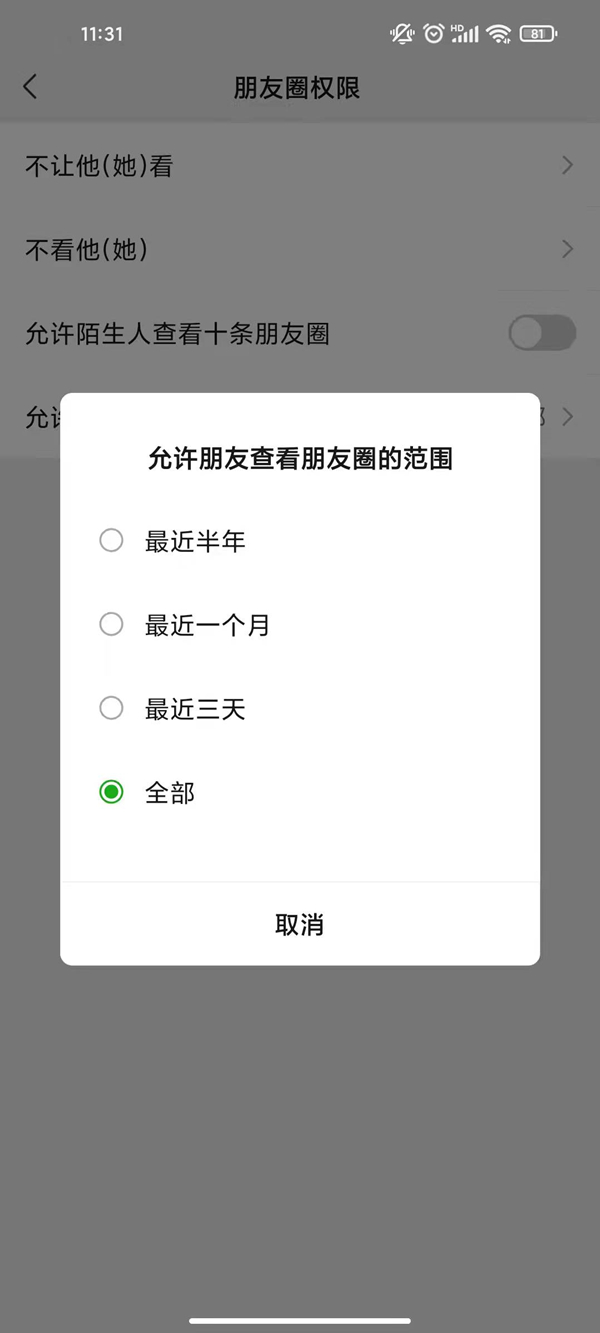 微信可以知道谁看了我的朋友圈吗微信不支持查看谁看了我的朋友圈,微信朋友圈可以设置允许朋友查看最近半年、最近一个月、最近3天或者是全部的朋友圈内容。
