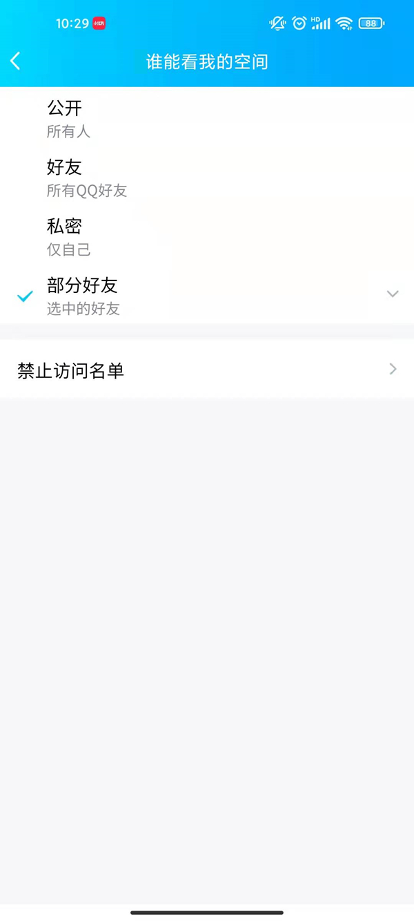 手机端:登录QQ空间->右上角功能按钮->【好友动态设置】->【权限与安全】->【谁能看我的空间】设置访问权限。
