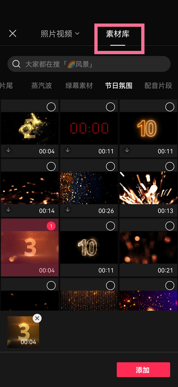 2、点击【素材库】,勾选喜欢的倒计时特效后点击【添加】即可。
