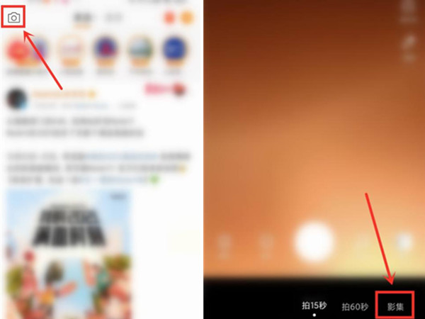 1、打开微博首页,点击左上角【相机】图标,点击底部【影集】。