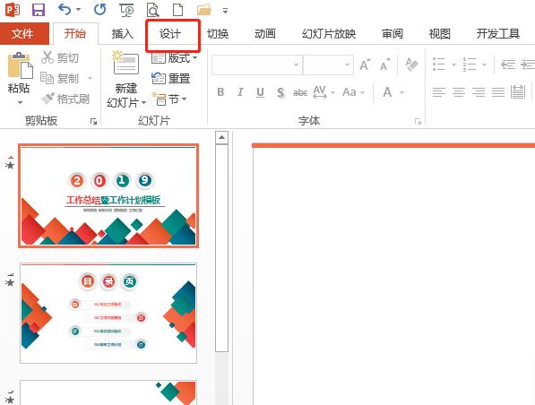 1、打开PPT,在顶部导航栏中点击【设计】。