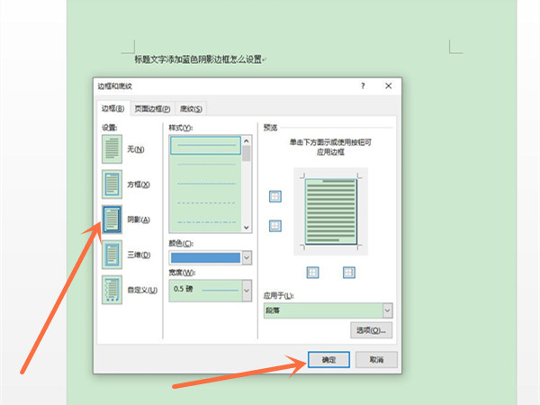 2、在边框页面点击阴影,在颜色选项下点击蓝色,再在应用于中选择段落,点击确定即可。