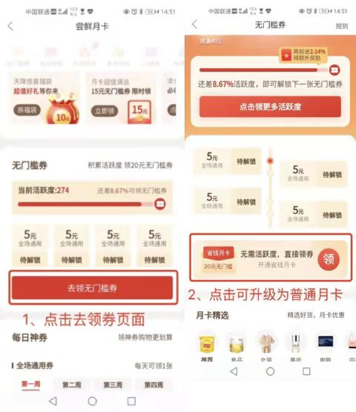 若您开通的是尝鲜月卡,您可以通过点击【立即续费】进入续费页面,点击【无需挖宝,直接领券】,升级后即可直接领取5元无门槛券,升级后(升级为普通月卡),您的尝鲜月卡会立即失效,若月卡到期未回本,您可以在失效后30天内联系多多为您申请差价。升级后您现在的月卡权益会平移到您的正式月卡上,并且无门槛券活跃度玩法也会升级成不需要做任务的券包玩法呢,您可以不做任务每周也能领取一张5元无门槛优惠券。