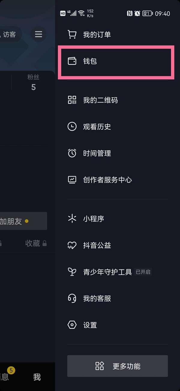 1、打开手机抖音,在“我”界面点击右上角三横,选择【钱包】。