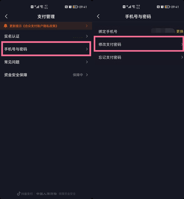 3、点击手机号与密码,选择修改支付密码,验证原密码后重新设置密码即可。