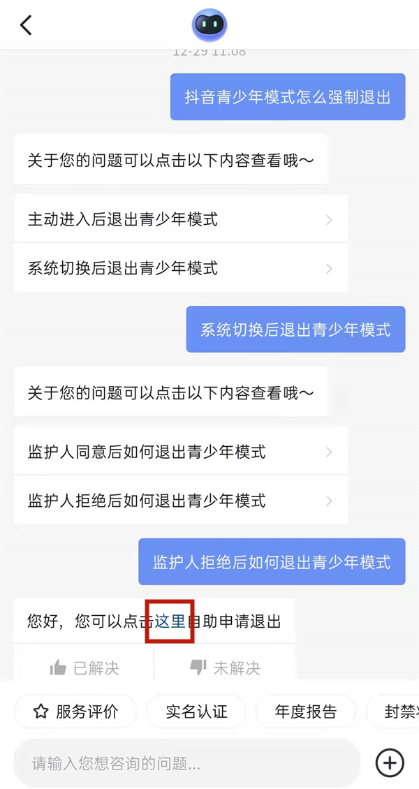 3、输入怎么退出青少年模式话术后,点击“这里”。