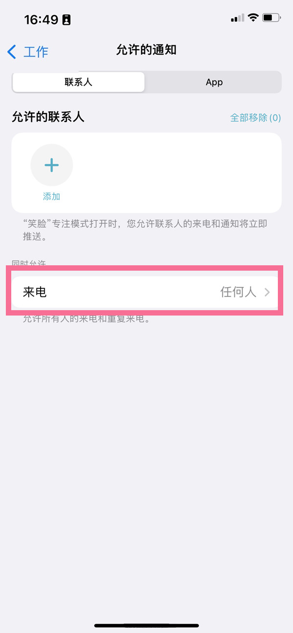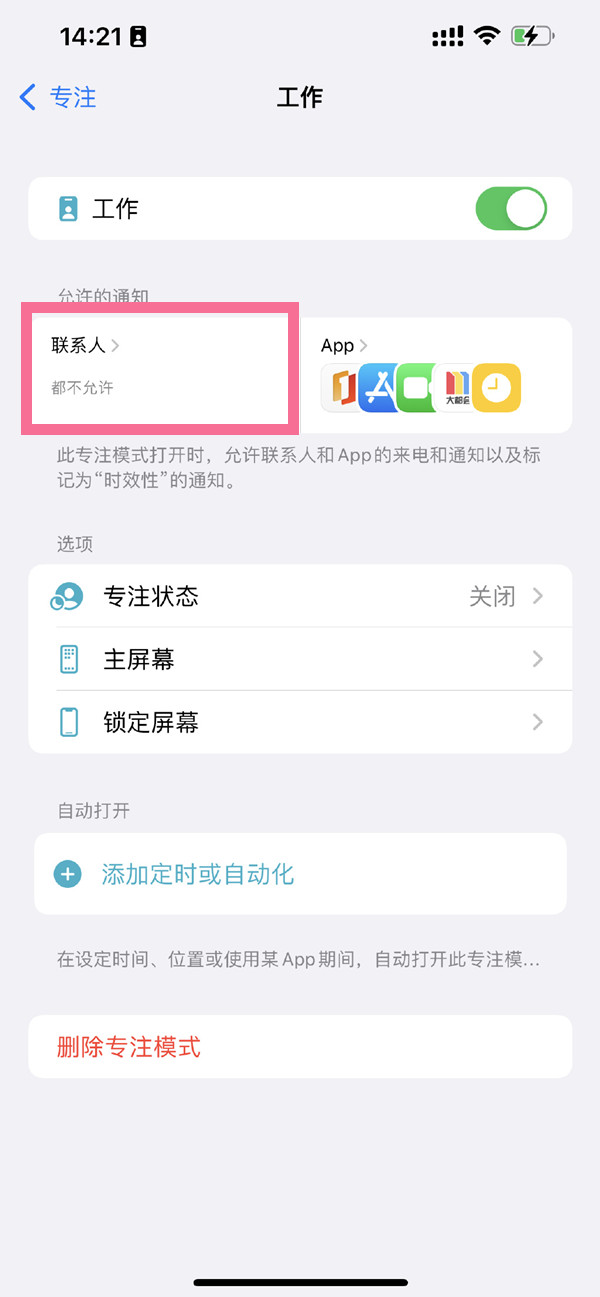 苹果设置专注模式时可设置是否允许联系人联系,在允许范围内的联系人电话可打进来,不在允许列表的联系人电话则不可打进来。设置方法如下: