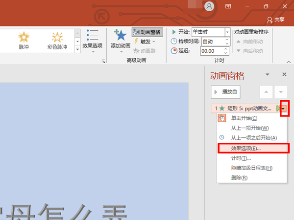 2、点击动画,点击动画后方的倒三角图标,点击【效果选项】。