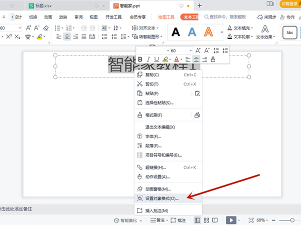 1、选中文字后,点击鼠标右键,点击设置对象格式。