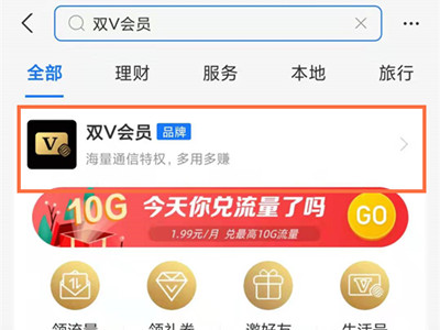 1、在支付宝首页搜索“双V会员”,点击双V会员小程序页面。