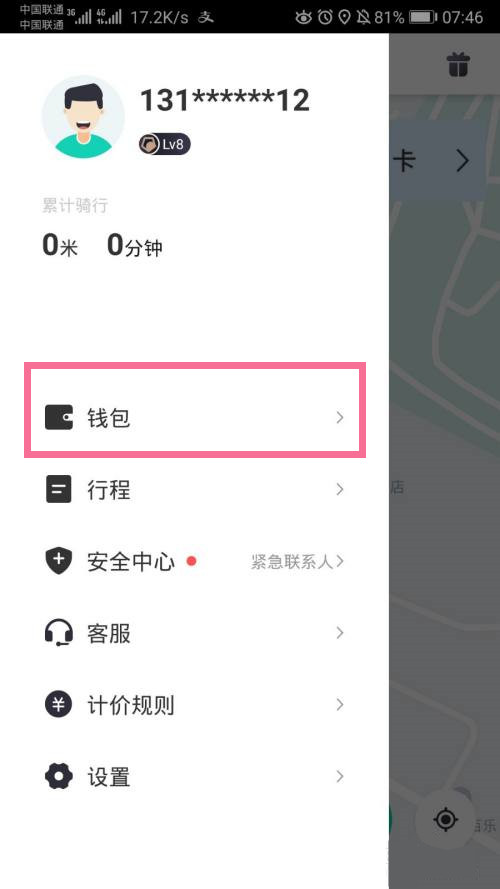 1、打开青桔APP,点击左上角个人头像,选择【钱包】。