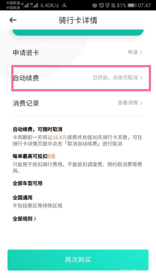 2、进入骑行月卡,点击【自动续费】。