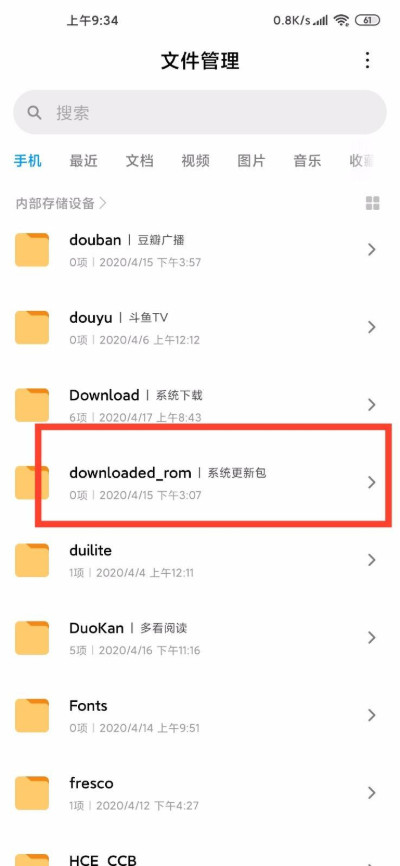 小米手机系统更新包在手机内置存储的downloaded_rom文件夹。你可以打开手机文件管理APP找到该文件夹进行查看。具体操作步骤如下: