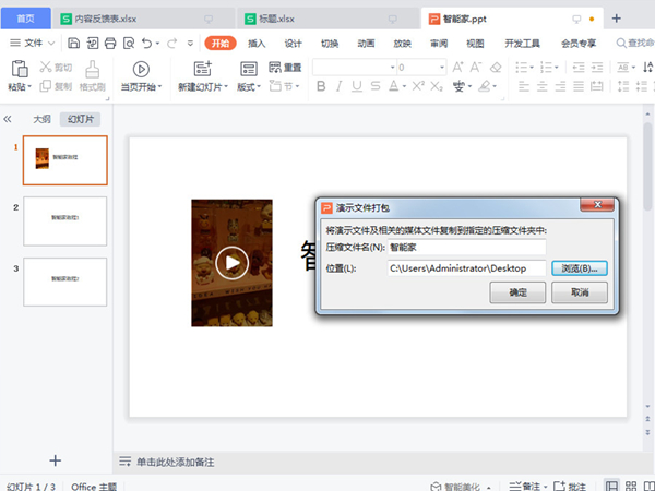 1、点击文件,点击文件打包里的将演示文档打包成压缩文件后,命名并保存文件。