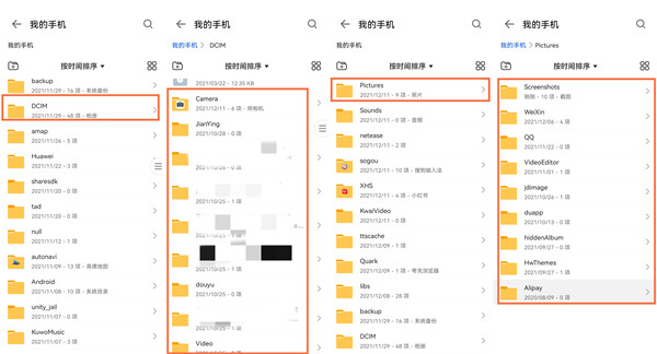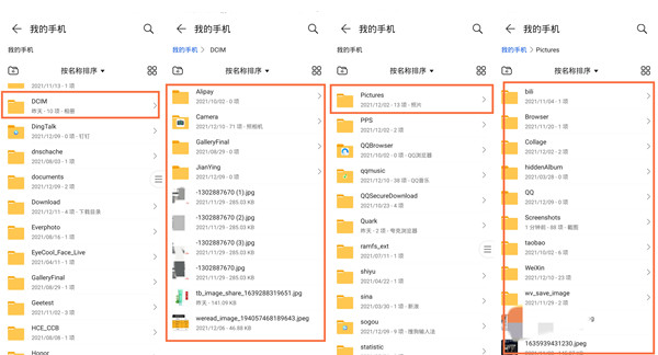 手机保存的图片从文件管理进入我的手机找到【DCIM】文件夹即可看到手机照相机拍摄的照片,在【Pictures】文件夹中可看到淘宝、微信、qq等应用以及截图保存的图片。