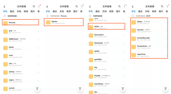 手机保存的图片从文件管理进入手机,在内部存储设备中找到【DCIM】文件夹即可看到手机照相机拍摄的照片以及截图,支付宝等保存的图片,在【Pictures】文件夹中可看到淘宝、微信、qq等应用保存的图片。