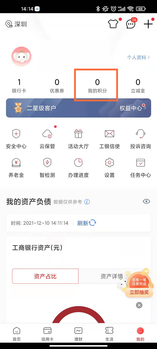 1、打开中国工商银行app,在我的页面点击“我的积分”。